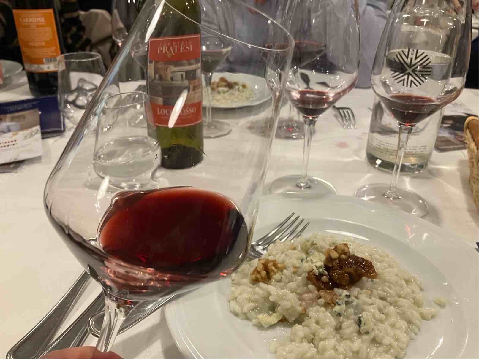 Il terzo vino degustato, “I Sassi di Lolocco”, è un Rosso toscano IGT Merlot 100% in purezza, uno dei vitigni più difficili da trattare. Per avere struttura, necessita di un terreno vocato, in questo caso contraddistinto da un’alta presenza di argilla. È un vitigno precoce che matura prima di tutti, circa due settimane prima del Sangiovese. Viene affinato per 24 mesi in barrique nuove al 100%. Violaceo, quasi nero, questo vino ha una struttura importante e sentori di mora e cioccolato. È stato abbinato a un risotto strepitoso al blu, con fichi secchi e noci.