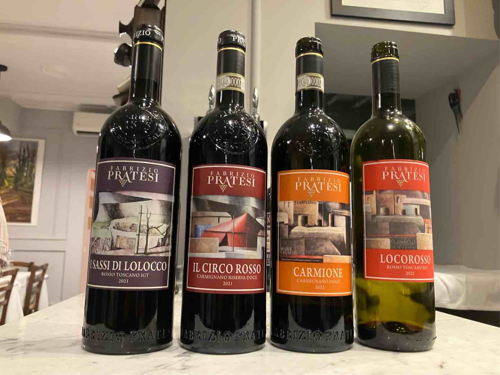 I vigneti dell’azienda Pratesi hanno il Montalbano alle spalle e guardano la Calvana, catena montuosa al confine tra le province toscane di Firenze e Prato. L’azienda ha origine nel 1875, quando Pietro Pratesi si trasferì a Lolocco. È questo borghetto ad aver ispirato il nome del primo vino degustato, “Locorosso” IGT. 100% Sangiovese, vinificato in tank di acciaio a temperatura controllata per circa 20 giorni e poi affinato per circa 6 mesi in acciaio. Viene fatto riposare per alcuni mesi dopo l’imbottigliamento. È un vino che “ha molta frutta”, denso di colore, sottile, fine, elegante e che si può apprezzare in svariati contesti. È stato abbinato alla carabaccia, la zuppa di cipolle toscana che Caterina de’ Medici portò in Francia e che fu l’antesignana della celebre soupe à l’oignon.