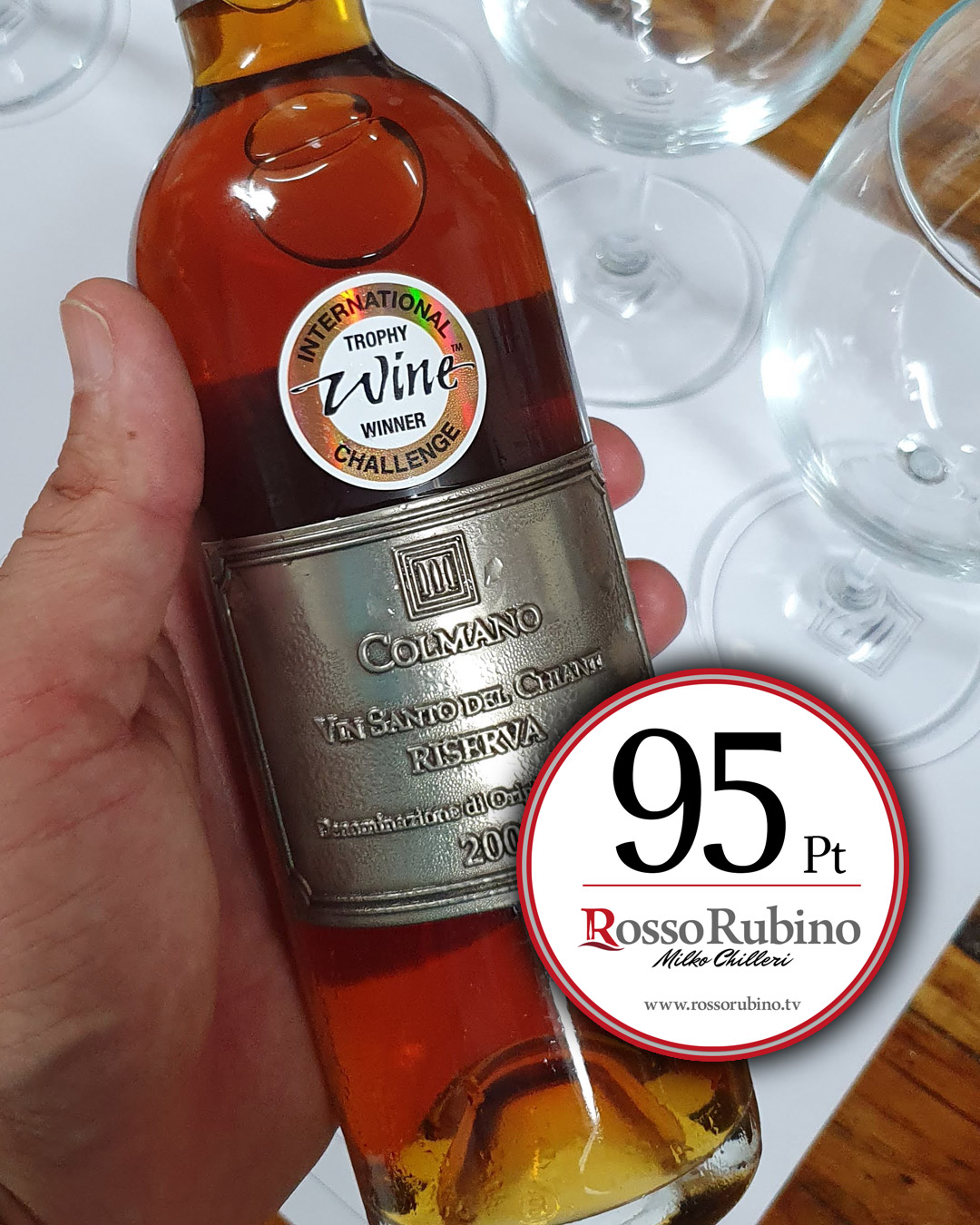 Malvasia e Trebbiano, di colore ambrato con riflessi dorati, al naso sentori si caramello, albicocca, frutta sotto spirito, miele di castagno e piacevoli richiami di legno affumicato. Palato mediamente dolce e di buona concentrazione, chiude con ricordi di mandorla amara e uva passa.