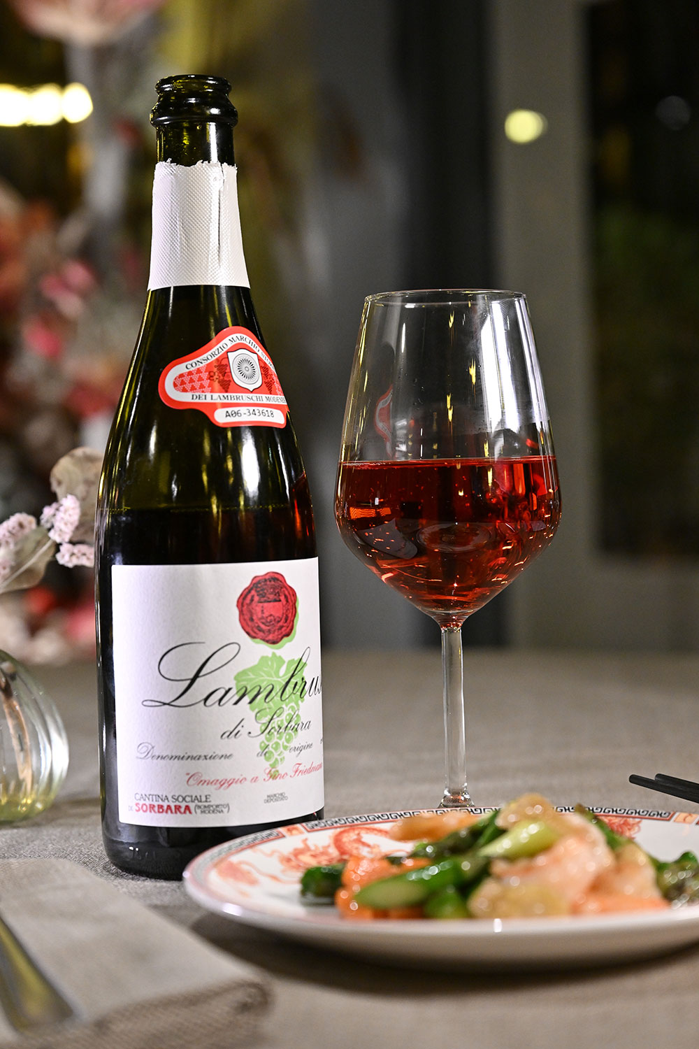Lambrusco di Sorbara, al naso si presenta energico: fiori rossi, pesca bianca e lamponi. Il sorso è morbido e convincente, freschezza e sapidità lo caratterizzano.