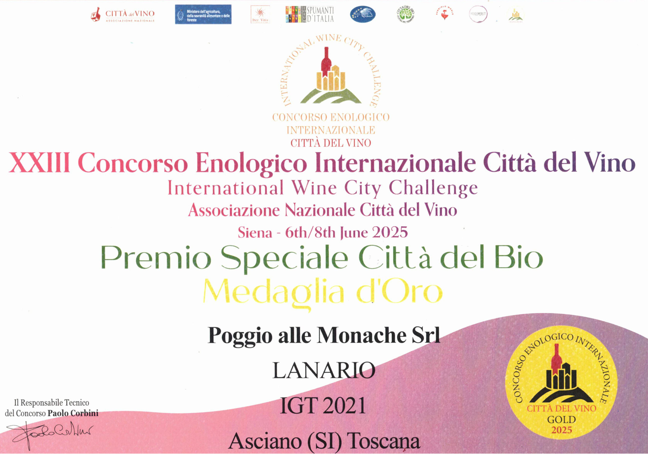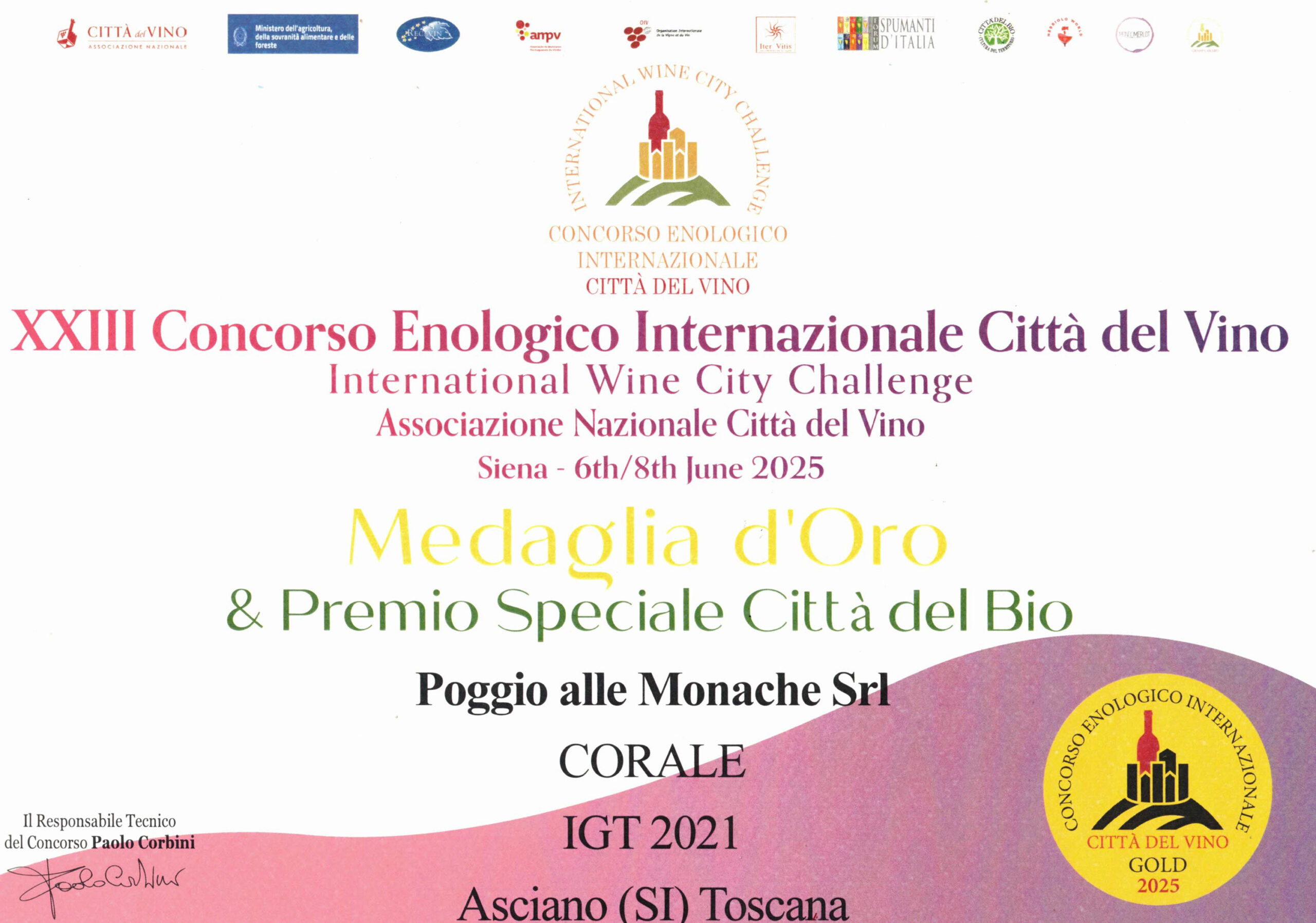 “È per me un grande onore rappresentare il Comune di Asciano e il territorio delle Crete Senesi in occasione della prestigiosa cerimonia del Concorso Enologico Internazionale Città del Vino. Con orgoglio condivido il riconoscimento ottenuto da una delle nostre aziende vinicole, Poggio alle Monache, che ancora una volta dimostra come il lavoro, la passione e il legame con il territorio possano generare frutti di eccellenza” ha dichiarato Mattia Mangone.