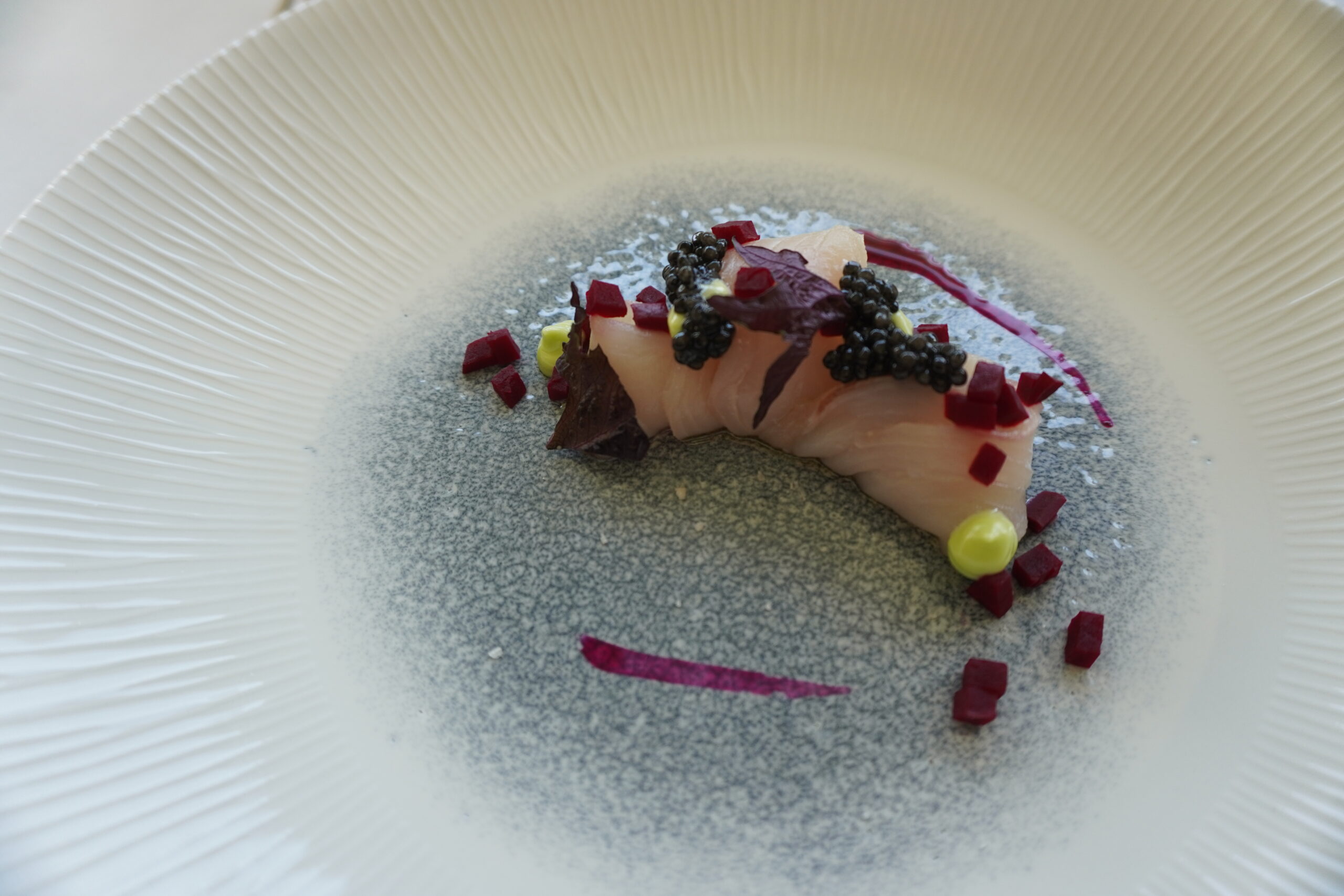Sashimi di ricciola, cremoso alla mentuccia, rape in agrodolce, caviale e shiso