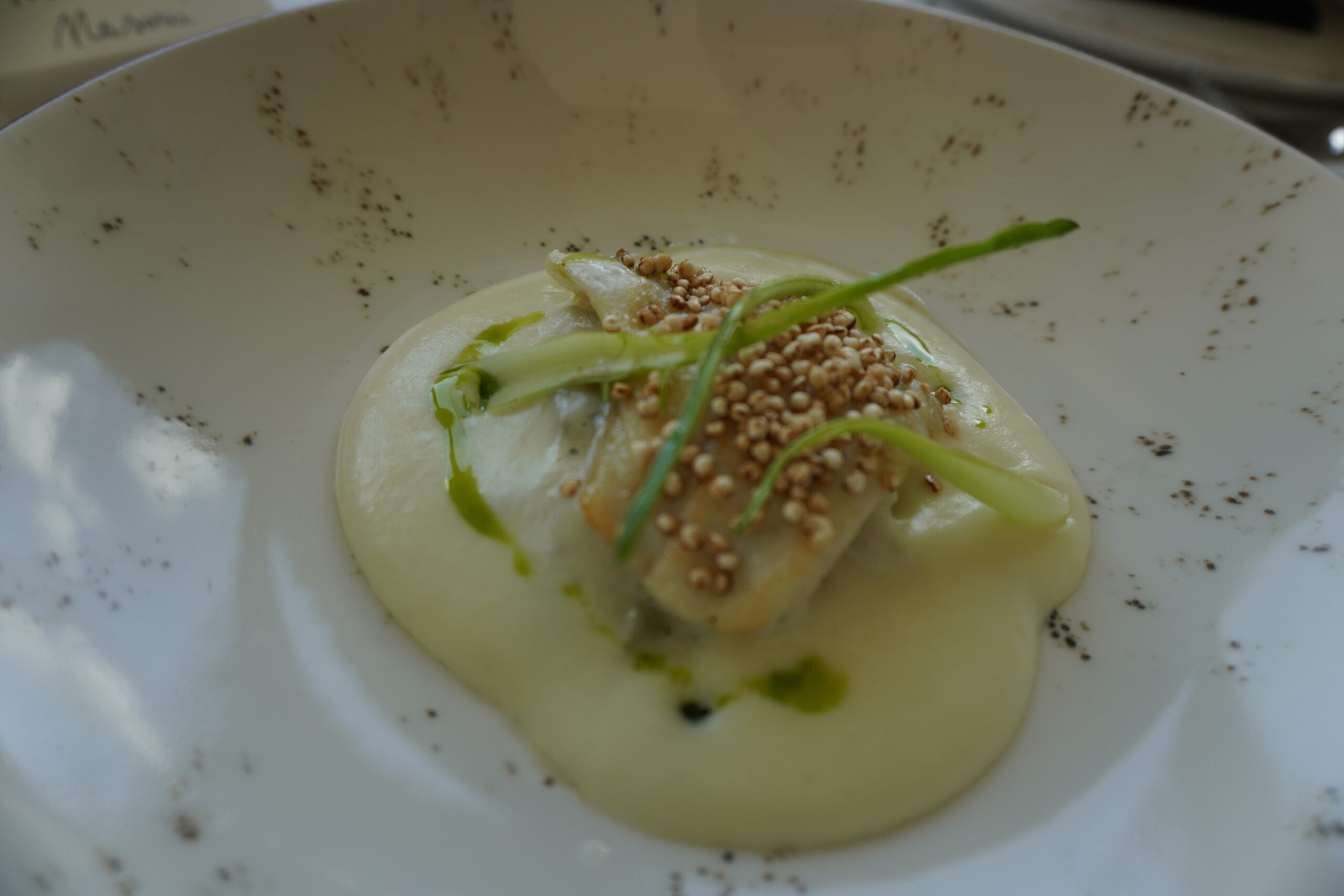 Rombo, scalogno allo Champagne, puntarelle, spuma di patate, erba cipollina e quinoa, vino in abbinamento Colli di Luni Vignebasse 2022