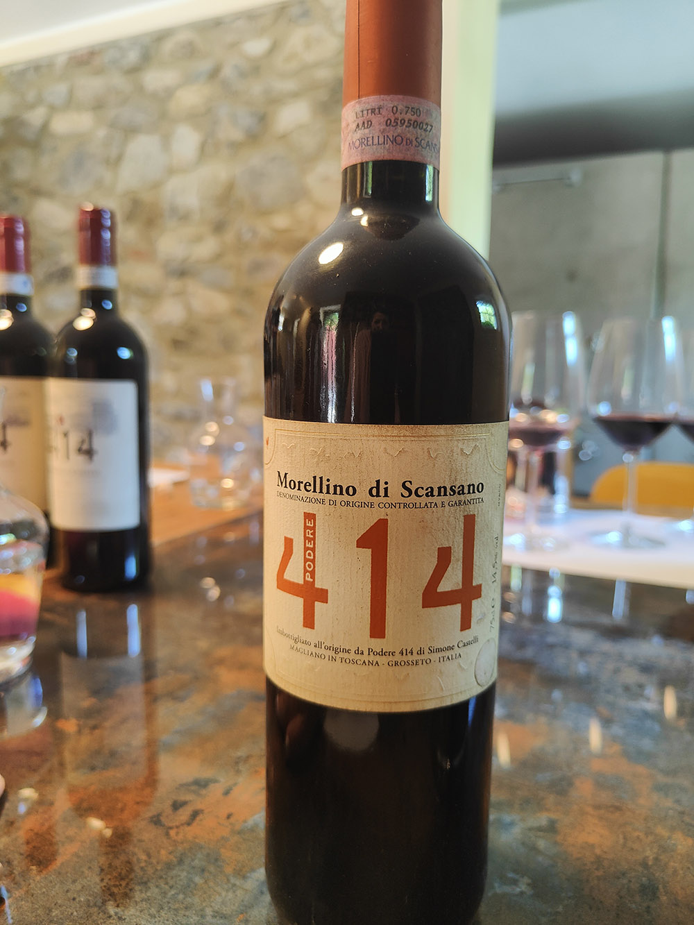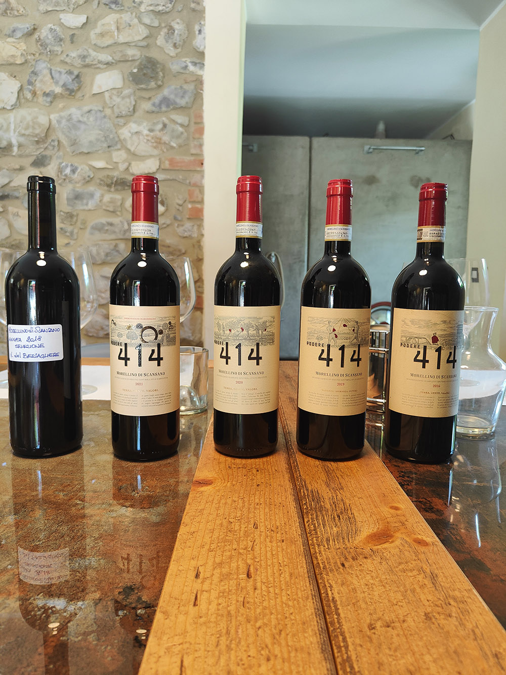 Podere 414 è focalizzato sul Morellino, un vino duttile ma non facile, di cui finalmente si sta iniziando a parlare più a fondo grazie alla presenza da alcuni anni in una specifica sezione di Chianti Lovers a Firenze. L’idea di base di Simone è arrivare a produrre un Morellino con 95% Sangiovese e 5% con altri vitigni per raggiungere la punta di personalità propria che distingua un’azienda dall’altra. La degustazione è stata quindi predisposta su una verticale di Morellino e di farci provare Rosato e Badilante a cena.