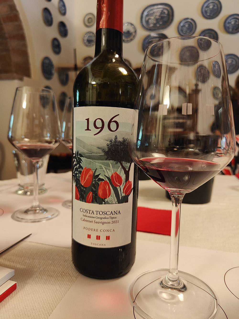 196 è un vino rosso IGT Costa Toscana, Cabernet Sauvignon in purezza. Il nome deriva dal numero civico, 196 appunto, del podere. Il vino viene sottoposto a 8 mesi di affinamento in toulipe di cemento e poi a due mesi di maturazione in bottiglia; è nato con l’idea precisa di raccogliere il Cabernet Sauvignon un pochino prima rispetto a quello che andrà nel blend mantenendo la parte acida e fresca. Al naso spicca subito un bouquet di note fruttate e vegetali e può essere bevuto anche in estate perché non è eccessivamente corposo e strutturato.
