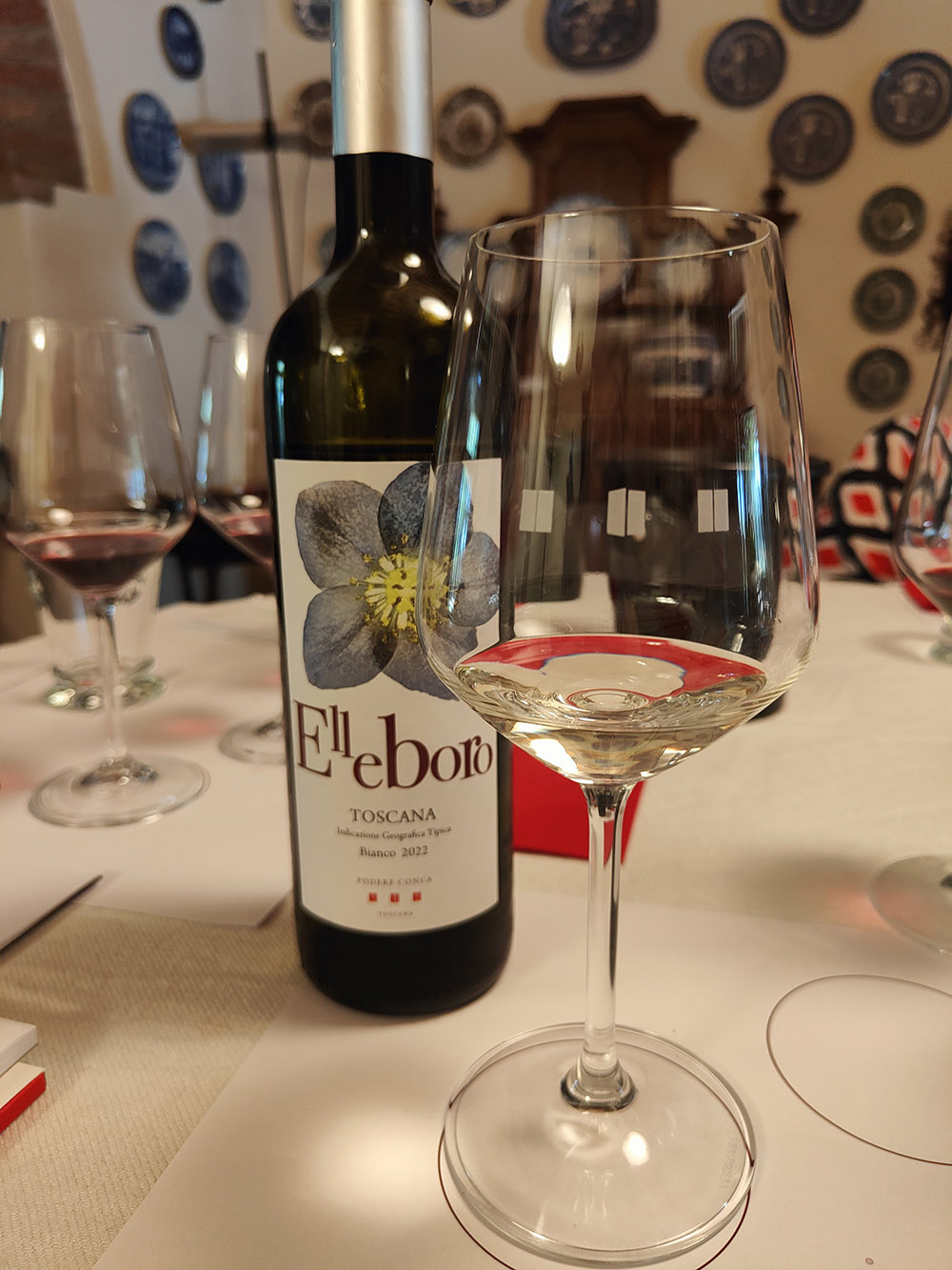 Elleboro è un vino bianco IGT Costa Toscana realizzato con un particolare bland di Viognier, Chardonnay e Sauvignon blanc, il cui nome è un omaggio al fiore conosciuto anche come Rosa di Natale. Ogni vitigno viene raccolto separatamente a fine agosto e sottoposto ad affinamento solo in acciaio. Nel bouquet si identificano note di frutta gialla con pesca e albicocca e una tonalità di ananas che conferisce una freschezza acidula.