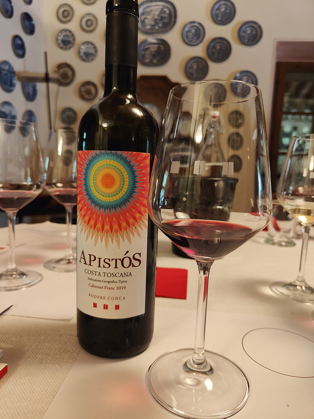 Apistós è un vino rosso IGT Costa Toscana, Cabernet Franc in purezza realizzato con la selezione dei Cabernet Franc dell’azienda. È uscito quest’anno sul mercato ed ha subito ricevuto due bicchieri Gambero Rosso. Sottoposto a circa 16 mesi di maturazione in barrique di rovere francese di primo e secondo passaggio, si presenta dal colore rosso intenso e vivace, quasi prepotente al naso ma in bocca molto equilibrato e rotondo con note eleganti di varietali erbacee e peperone verde.